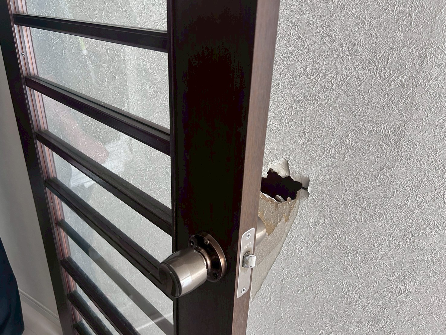 扉を勢いよく閉めた際に、壁にドアノブが突き刺さってしまい、建具と壁が壊れたとのことで火災保険申請可能かご依頼いただきました👷🏻♂️